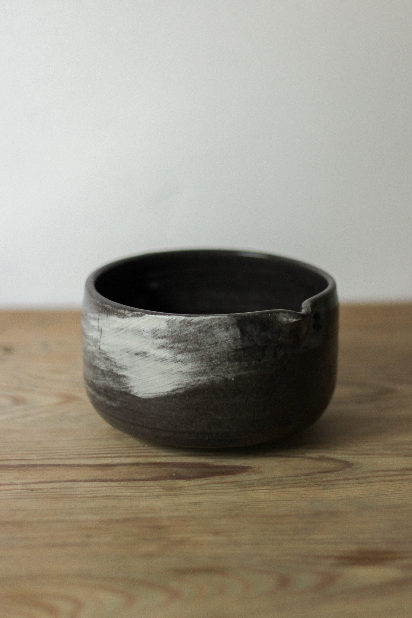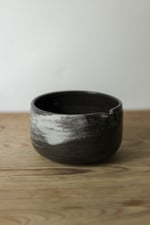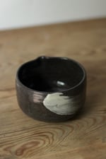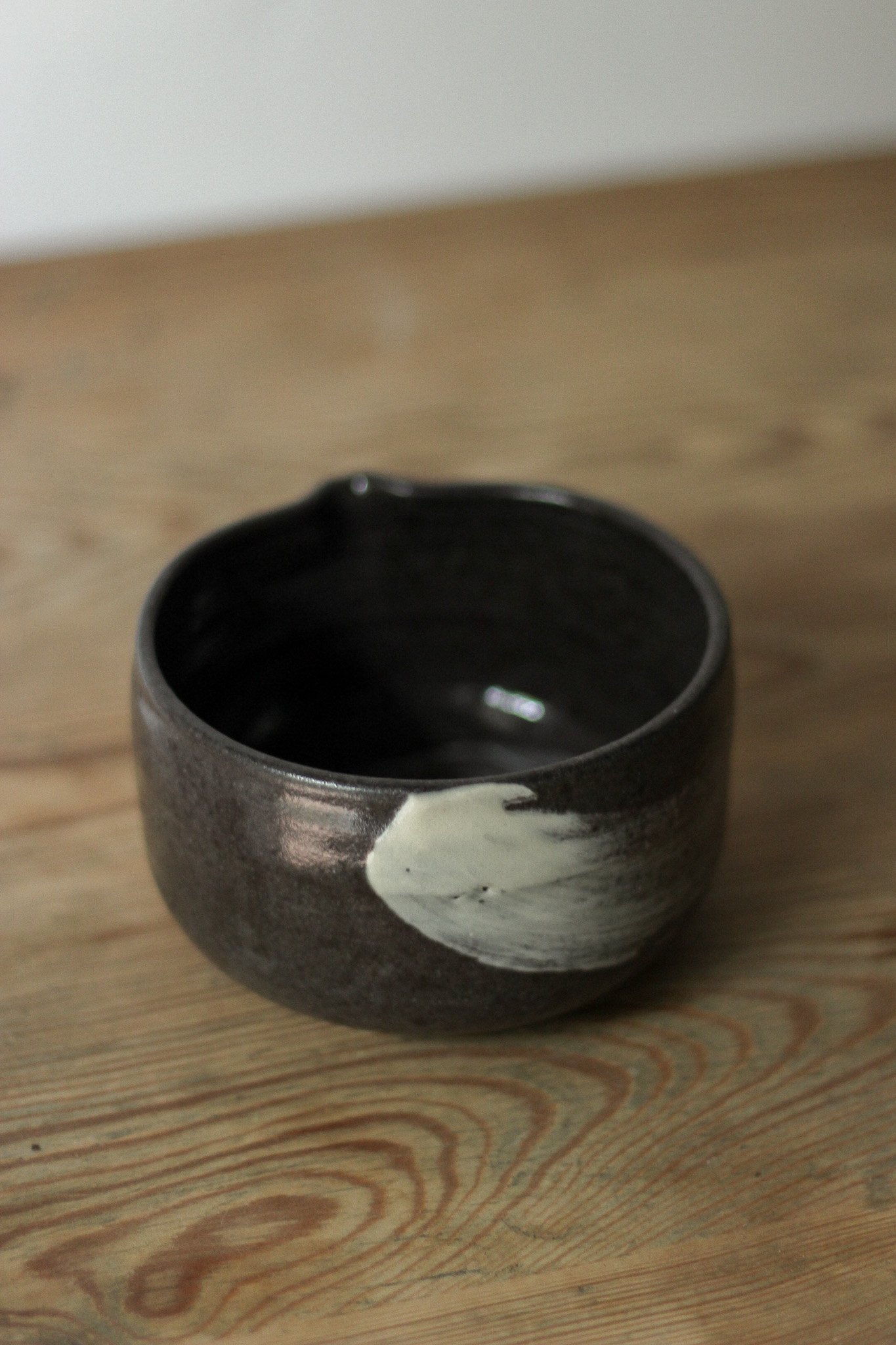 made with black stoneware clay on pottery wheel, decorated with white porcelain in hakeme style